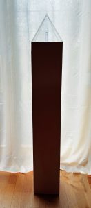 Das jüngst entstandene Werk „Mikrochip“ besteht aus einem Stahlrahmen von 20x20x20 cm. Darin steht eine blau angeleuchtete 1 cm dünne Plexiglassäule, auf der ein Mikrochip liegt.