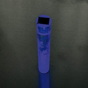 In meinem Werk „Mikro“ passt der Chip auf eine Acrylstange von 1cm Durchmesser. Getriggert durch das blaue Licht fordert der superkleine Inhalt zu intensivem Hinschauen heraus. Innere Größe ist in eine kleine gestalterische Form gebracht.